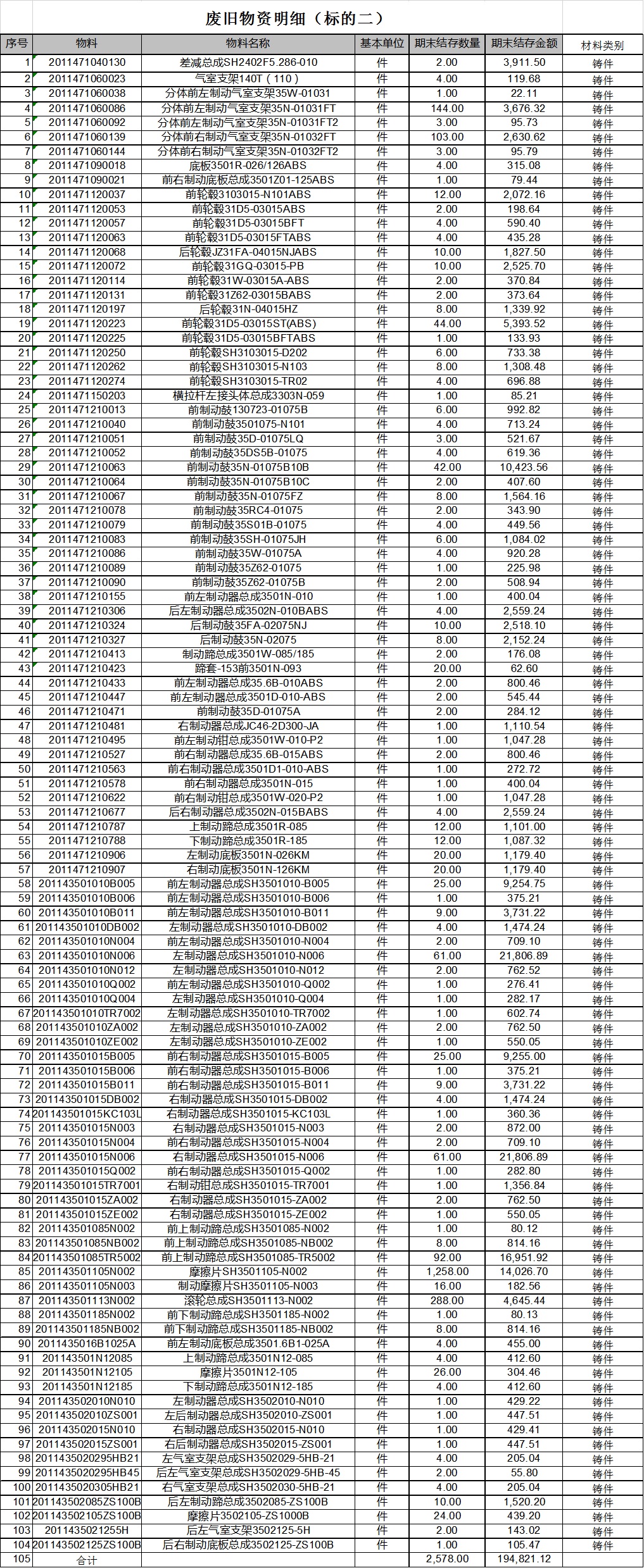 三環(huán)車橋公司過山廠區(qū)倉庫和后街廠區(qū)倉庫有一批廢舊物資(明細附后),本批物資分兩個標的招標銷售,標的一包括鋼件、橡膠件和設(shè)備配件;標的二鑄鐵件。擬按重量進行處理,數(shù)量以實際過磅為準。